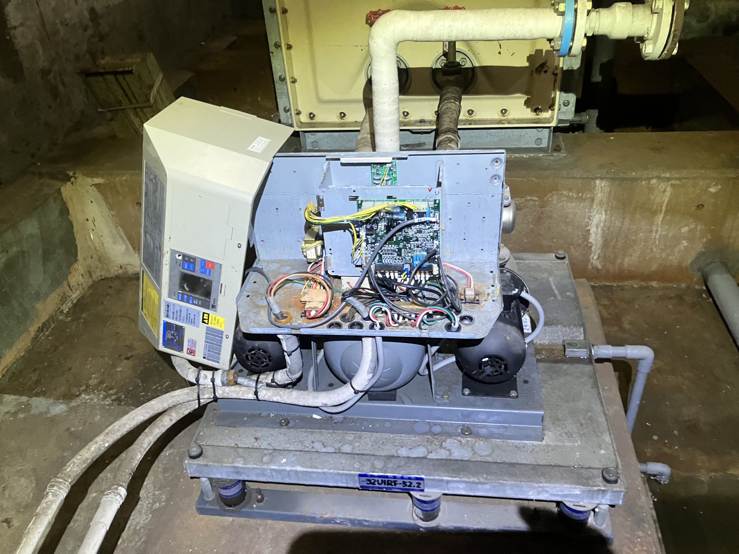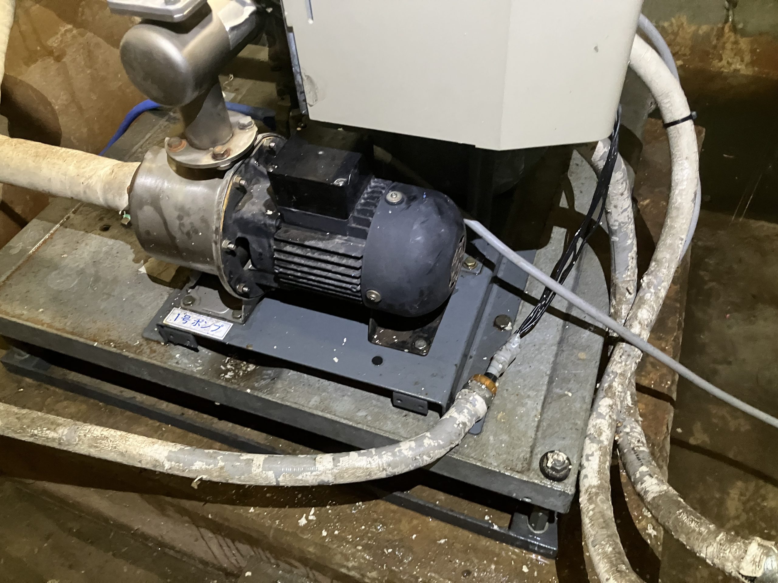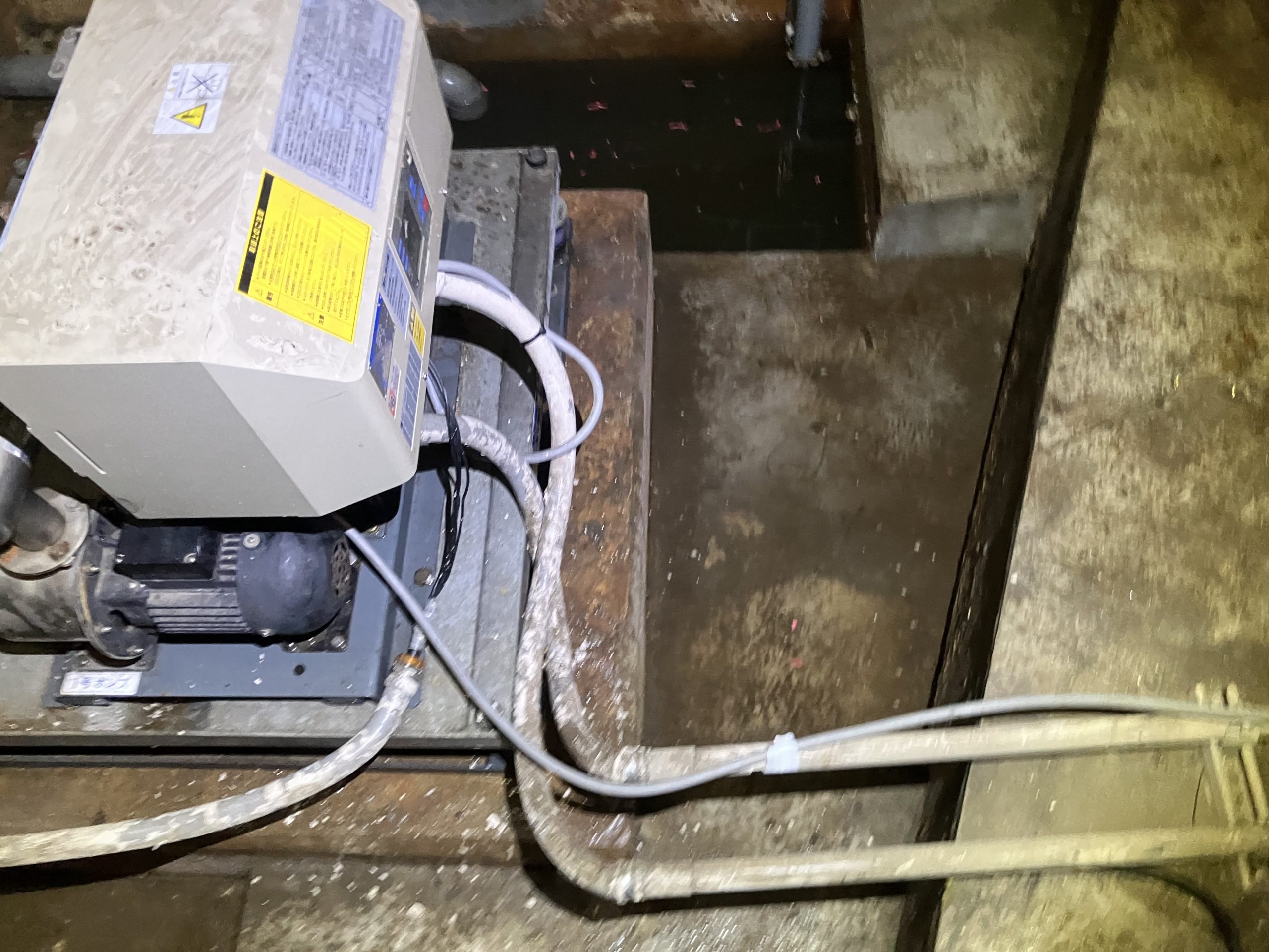 ポンプ室に溜まった水は別業者さんが排水をしてくれていました。 ポンプはすぐに納品することが難しいため、本工事は後日で対応、ひとまず緊急の復旧作業をし、 無事に動かすことができました。