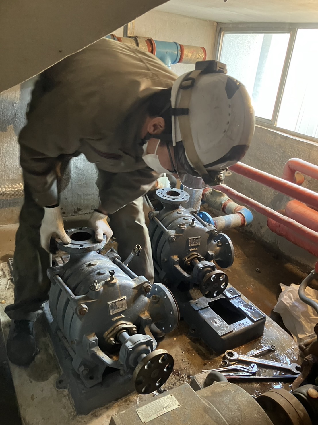 昨年の4月にお問い合わせがあり、 揚水ポンプの1台が動かないので修理か更新で見積もり依頼がありました。 お問い合わせ日に近くの現場にいたものが現調に行き、 型式も古かったので、更新で見積もりを出しました。