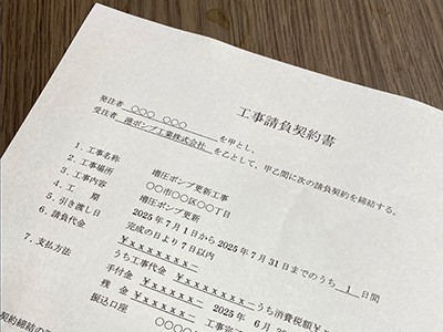 書面でのご契約のやりとり、内金の振込、ポンプの納期確認、工事日程のご相談。